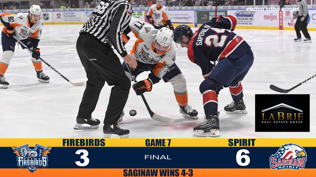 Saginaw, Mich. – The Firebirds concluded Round 1 of the OHL Playoffs with a Game 7 defeat at the hands of their in-state rivals at the Dow Event Center on Monday. Amadeus Lombardi netted his fourth and fifth goals of the playoffs and Coulson Pitre found twine for the Birds. Saginaw was led by a two-goal and four-point night by Matyas Sapovaliv. Rookie netminder Nathan Day backstopped the Firebirds again and made 24 saves on 28 shots. Overage veteran Tristan Lennox won his fourth game of the series with 20 saves.