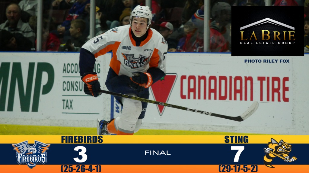 Sarnia, Ont. – Amadeus Lombardi extended his OHL-leading point streak to 13 games tallying two goals on the afternoon in a 7-3 loss to the Sarnia Sting. Gavin Hayes also extended his streak to nine games (1 A). Coulson Pitre and Riley Pierecy added two assists each. Ryan Mast and Ethan Del Mastro recorded three points each (1 G, 2 A). Zach Filak and Luca DelBelBelluz also added a goal and a helper each. The Firebirds turned to Will Cranley to man the crease. Cranley stopped 18 of 24 of the shots he faced. Benjamin Gaudreau got the start for the Sting, stopping 28 of 31 shots, recording his 19th win of the year.