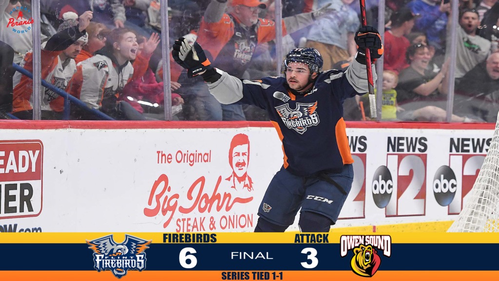 Next Up: Games 3 & 4 of the series between Flint and Owen Sound will be played on the road on Monday and Wednesday evenings. Be sure to tune in to US 103.1 FM or online at www.us103.com beginning at 6:40 p.m. (ET) to follow the Firebirds on the road with broadcaster Jack Sznewajs. Game 5 is scheduled for Sunday, May 1. Tickets for Game 5 of the postseason will be available at noon tomorrow from ETIX HERE, or beginning at 11:00 a.m. (ET) Tuesday at the Dort Financial Center Box Office or by calling 1-800-514-3849.