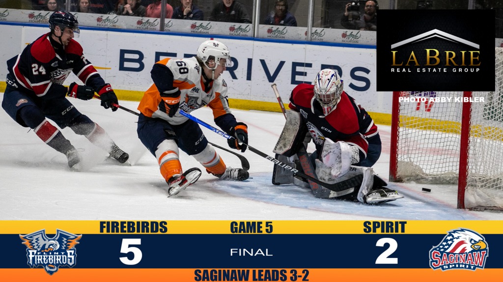 The Firebirds had their backs against the wall tonight in Saginaw and responded by defeating the Spirit 5-2. Tristan Bertucci and Gavin Hayes both had multi-point nights, both tallying two helpers. Zacharie Giroux also recorded multiple points (1 G, 1 A). Matyas Sapovaliv stayed hot, recording two assists on the night for the Spirit. Netminders for both teams remained the same, with Nathan Day getting the nod for the Birds making 38 saves en route to being named the First Star of the game, and Tristian Lennox was between the pipes for the Spirit stopping 19.