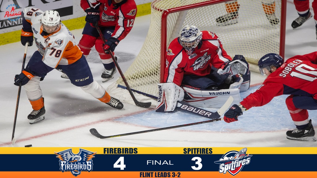 Flint was outshot 12-11 in the middle stanza, and outdrew 14-13. The Spitfires scored on their lone man-advantage situation while the Firebirds went scoreless in three chances.