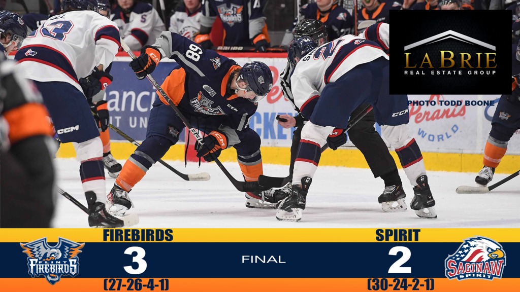 The Birds held a 3-1 edge entering the second intermission. Flint outshot the Spirit 13-10 in period two and outdrew Saginaw 25-18 through 40 minutes of play. The Firebirds went 2-for-2 with the man advantage in the first two periods while holding the visitors to just one of four.
