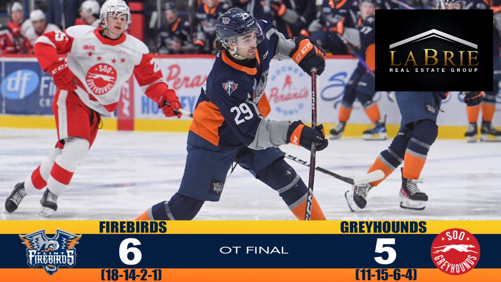 Flint, Mich. – The Firebirds jumped out to an early 2-0 lead, then surrendered four straight to the Greyhounds on Friday night in Flint. A late comeback with the tying goal inside the final three minutes forced overtime, and Dmitry Kuzmin logged the game-winner 3:16 into the extra frame and was named ‘First Star’ of the tilt. Rookie Kaden Pitre was the ‘Second Star’ after scoring two goals in regulation. Nathan Day started between the pipes for the Firebirds and posted five saves in the first period before veteran Will Cranley assumed the goaltending duties. Cranley played the final 45 minutes, stopping all 21 shots faced to pick up his 13th win of the year in his 100th career OHL game. The Greyhounds went with veteran Samuel Ivanov in net, and he turned aside 25 of the 31 shots.