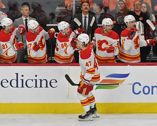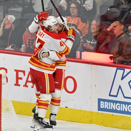Connor Zary #47 of the Calgary Flames is congratulated by his teammate for his goal against the Philadelphia Flyers during the first period.