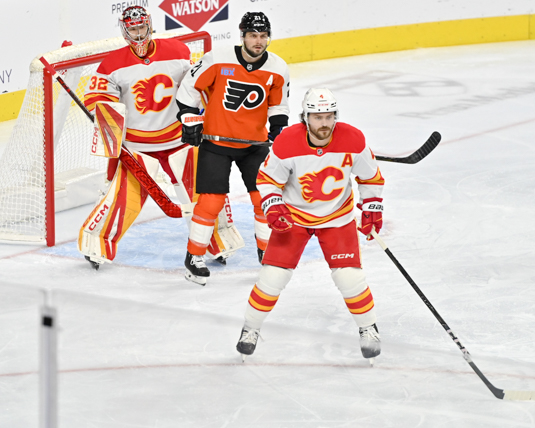 Kevin Bahl #7 of the Calgary Flames, Scott Laughton #21 of the Philadelphia Flyers and goalie Dustin Wolf #32 of the Calgary Flames