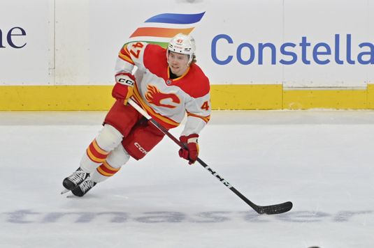 The Flames’ Connor Zary hit for a double in the win, starting on the Flames’ fourth line.