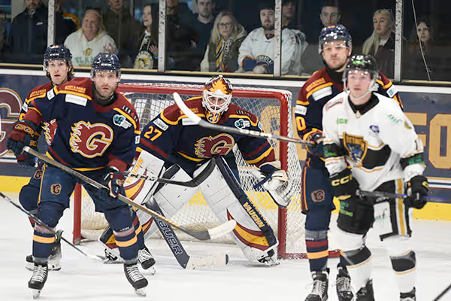 Tait broke the seal on the scoring less than 3 minutes into the middle set and James Shearer’s first in Flames kit in the 35th minute had the home team up by a pair. Shortly thereafter, Panthers had an opportunity to cut their deficit in half with a penalty shot, but McAdam made sure advantage Flames remained in effect to begin the 3rd.