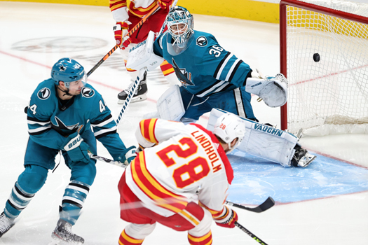 Elias Lindholm (28) scores past Sharks goalie Kaapo Kahkonen early in the third period – Photo by Jack Lima