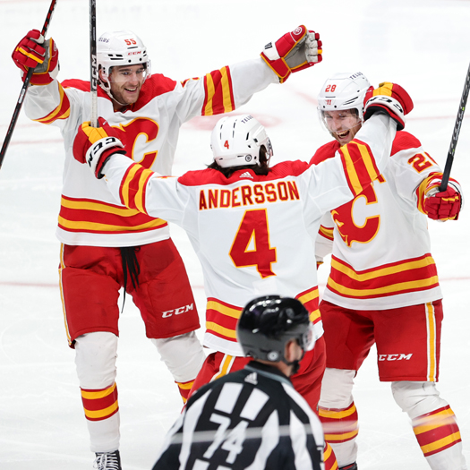 Elias Lindholm (Right) celebrates his second goal in eleven seconds in third period with Rasmus Andersson (4) and Noah Hanifin (55) – Photo by Jack Lima