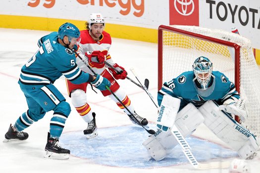 Sharks defenseman Radim Simek (51) blocks a shot in front of Mikael Backlund (11) – Photo by Jack Lima