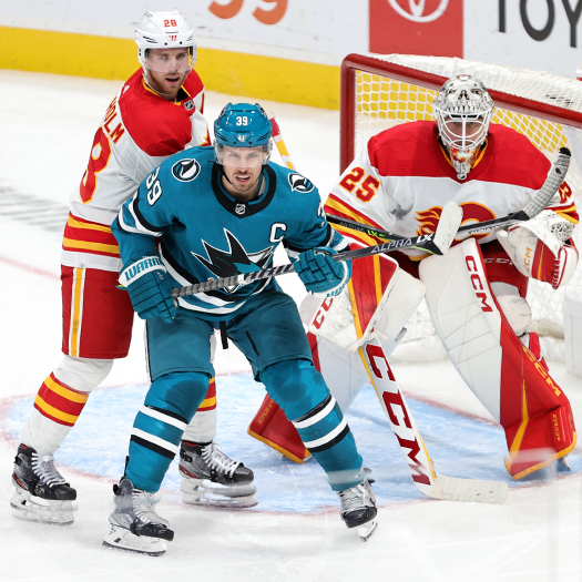 Logan Couture (39) positions himself in front of Elias Lindholm (28) and goalie Jacob Markstrom during a Sharks second period power play – Photo by Jack Lima