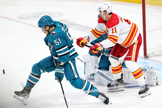 Tomas Hertl (48) crashes the net and goalie Jacob Markstrom as Michael Backlund (11) and Noah Hanifin (55) look to clear the puck – Photo by Jack Lima