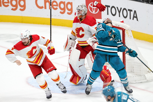 Tomas Hertl (48) crashes the net and goalie Jacob Markstrom as Michael Backlund (11) and Noah Hanifin (55) look to clear the puck – Photo by Jack Lima