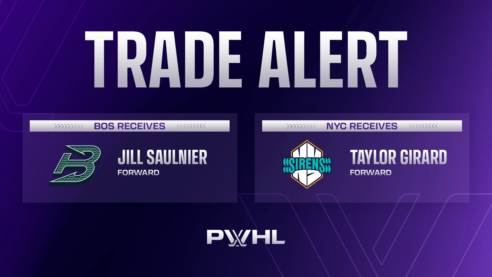 NEW YORK and TORONTO – The Boston Fleet and New York Sirens have completed a trade, with Boston acquiring forward Jill Saulnier from New York in exchange for forward Taylor Girard.