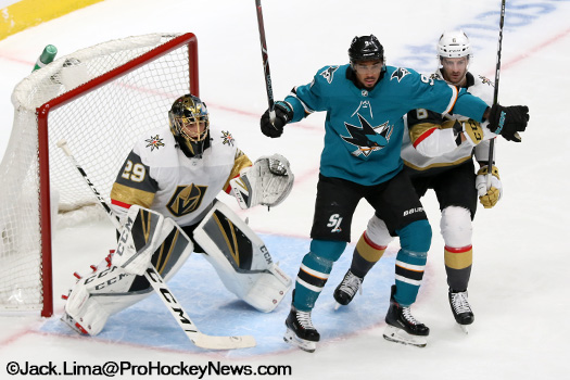 Sharks forward Evander Kane (9) try to sceen Golden Knights goalie Marc-Andre Fleury as Colin Miller (6) defends – Photo by Jack Lima