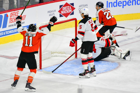 Travis Konecny #11 reacts to the goal scored by Noah Cates #27 of the Philadelphia Flyers Photo credit – Jack.SMart@prohockeynews.com
