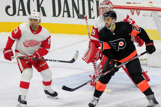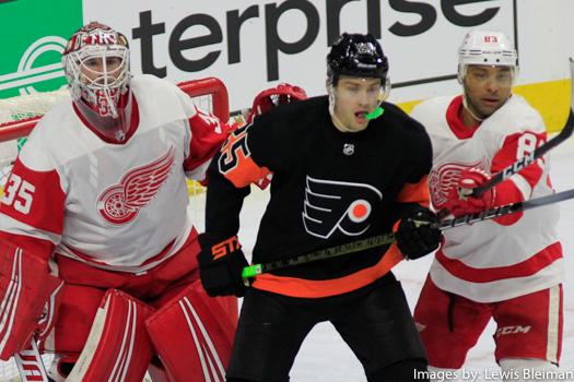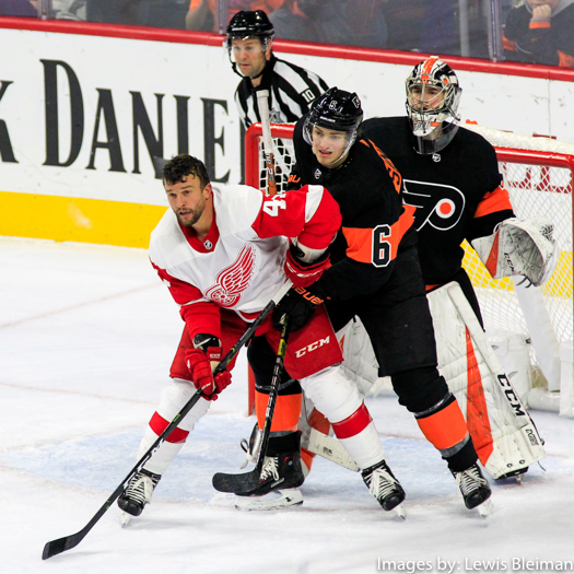 Center Luke Glendening (#41) of the Detroit Red Wings, Defenseman Travis Sanheim (#6) and Goalie Carter Hart (#79) of the Philadelphia Flyers