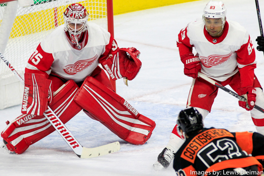 Detroit Red Wings Goalie Jimmy Howard (#35), Left Wing James van Riemsdyk (#25) of the Philadelphia Flyers and Defenseman Trevor Daley (#83) of the Detroit Red Wings