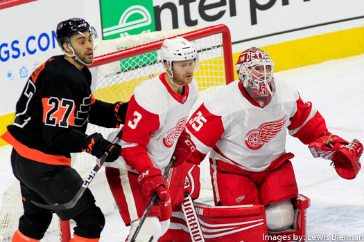 Right Wing Justin Bailey (#27) of the Philadelphia Flyers, Defenseman Nick Jensen (#3) and Goalie Jimmy Howard (#35) of the Detroit Red Wings