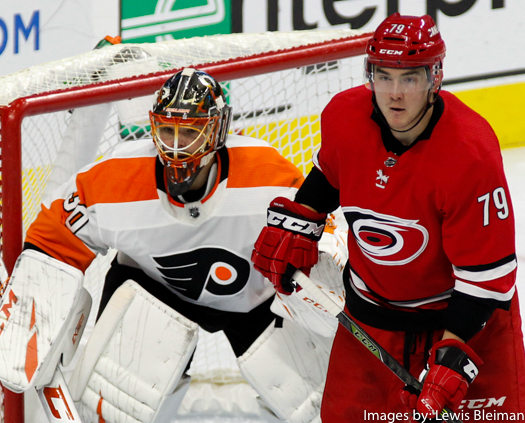Goalie Michal Neuvirth (#30) of the Philadelphia Flyers, Left Wing Micheal Ferland (#79) of the Carolina Hurricanes.