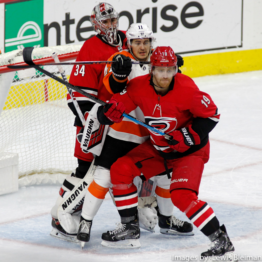 Goalie Petr Mrazek (#34) of the Carolina Hurricanes, Center Travis Konecny (#11) of the Philadelphia Flyers, Defenseman Dougie Hamilton (#19) of the Carolina Hurricanes