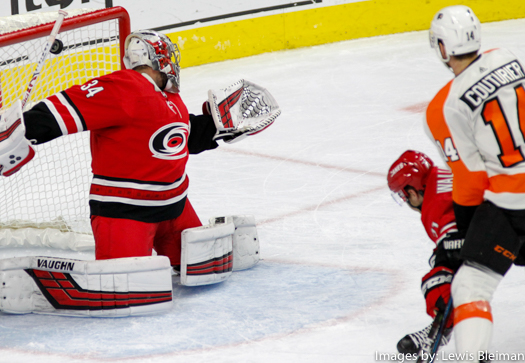 The shot by Center Sean Couturier (#14) of the Philadelphia Flyers enters the net above the glove hand of Goalie Petr Mrazek (#34) of the Carolina Hurricanes