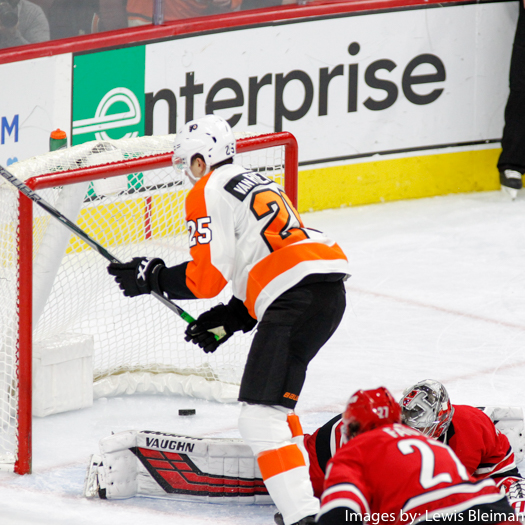 Left Wing James van Riemsdyk (#25) of the Philadelphia Flyers scores in the third period agains the Carolina Hurricanes.