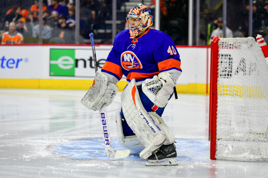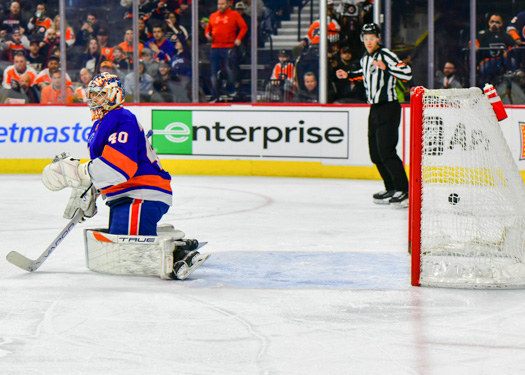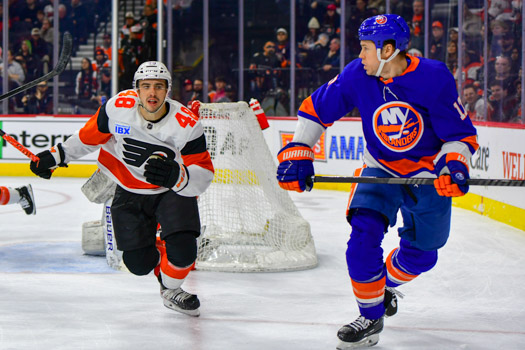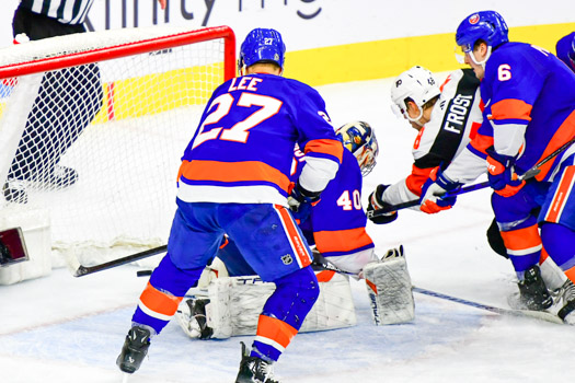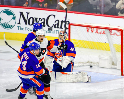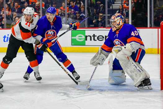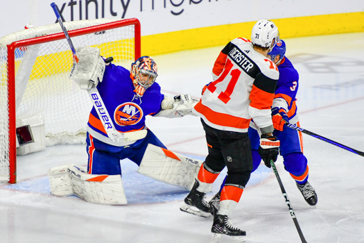 Tyson Foerster #71 of the Philadelphia Flyers, Adam Pelech #3 and goalie Semyon Varalamov #40 of the New York Islanders