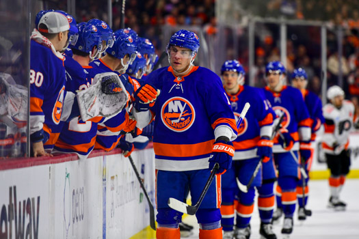 Matt Martin #17 of the New York Islanders receive congratulations from his teammates for his goal in the first period against the Philadelphia Flyers.