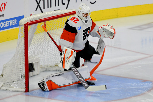 Rookie goalie Ivan Fedotov #82 of the Philadelphia Flyers starts the second period against the New York Islanders