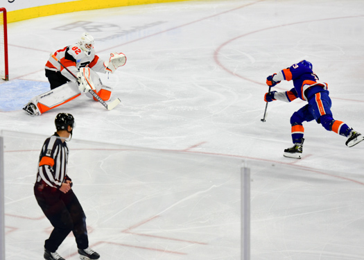 PHI_1827 Published April 2, 2024 at 525 × 375 in Flyers can’t rally for win, lose to Islanders in OT, 4-3 Mathew Barzal #13 of the New York Islanders goes one on one against Philadelphia Flyers goalie Ivan Fedotov #82