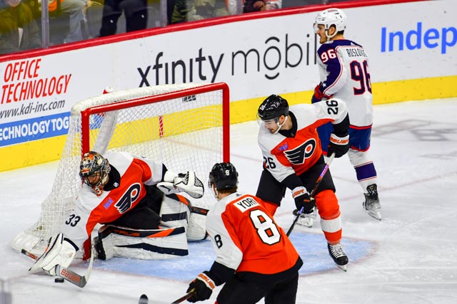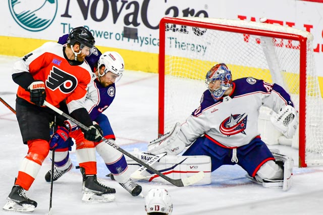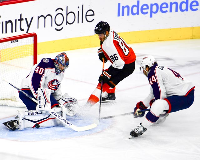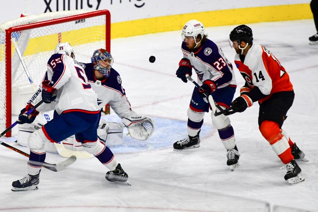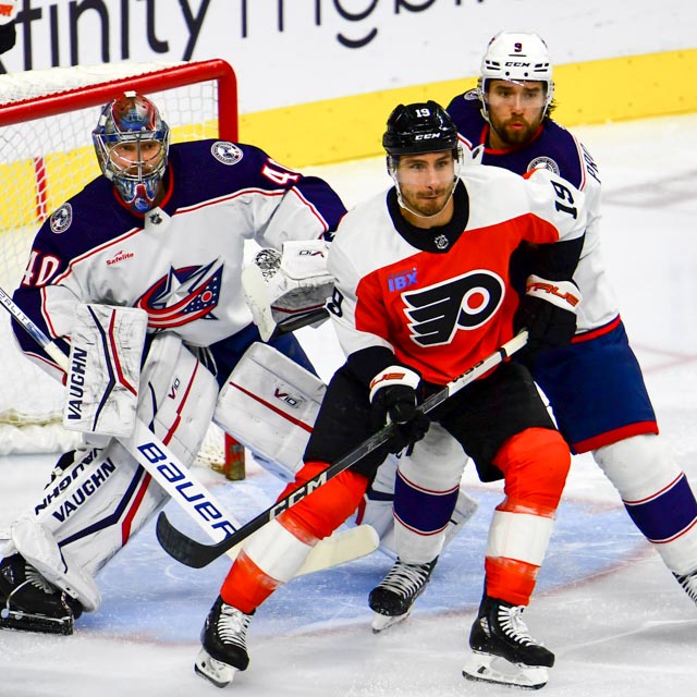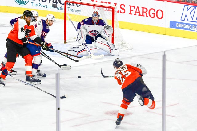 PHILADELPHIA – The visiting Columbus Jackets rallied from a 2-0 deficit on Thursday with a pair of goals in the third period to tie the game, 2-2, and force extra time.
