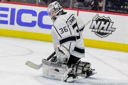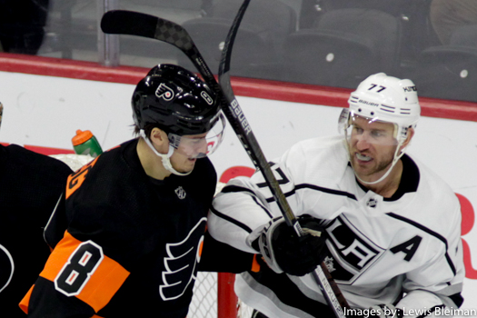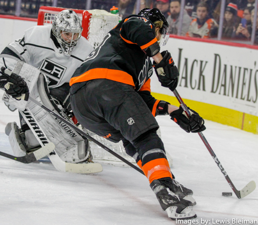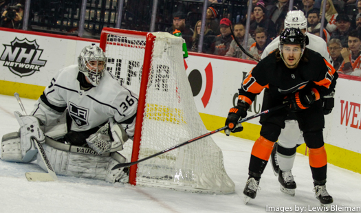 Jack Campbell #36 of the Los Angeles Kings and Travis Konecny #11 of the Philadelphia Flyers look to the boards for the puck.