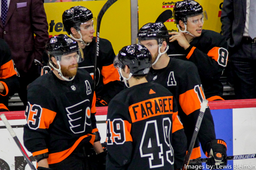 Jakub Voracek #93, Joel Farabee #49, and Sean Couturier #14 of the Philadelphia Flyers have a discussion during a break in the third period.