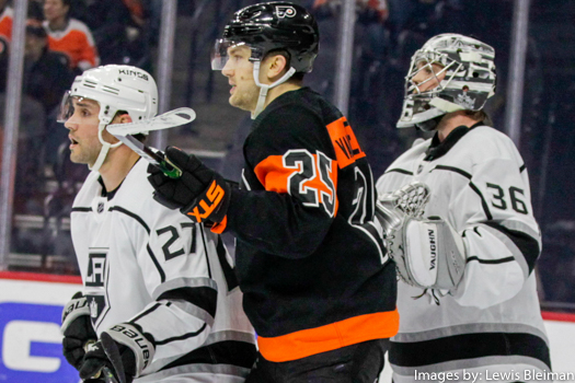 James van Riemsdyk #25 of the Philadelphia Flyers is surrounded by Los Angeles Kings Alec Martinez #27 and Jack Campbell #36