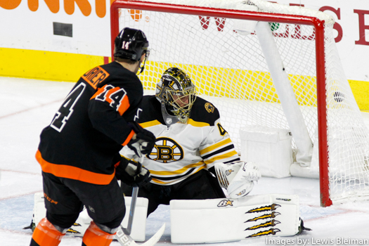 Center Sean Couturier (#14) of the Philadelphia Flyers scores against Goalie Jaroslav Halak (#41) of the Boston Bruins in the second period