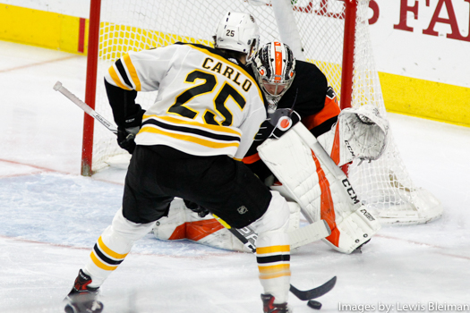 Defenseman Brandon Carlo (#25) of the Boston Bruins carries the puck in on Goalie Carter Hart (#79) of the Philadelphia Flyers