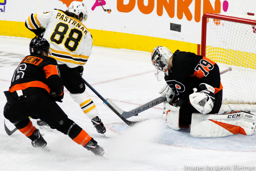Defenseman Travis Sanheim (#6) of the Philadelphia Flyers chases down Right Wing David Pastrnak (#88) of the Boston Bruins in front of Philadelphia Flyers Goalie Carter Hart (#79)