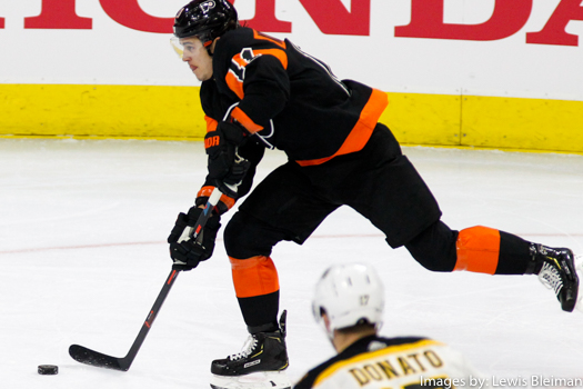 Left Wing Jake DeBrusk (#74) of the Boston Bruins, Defenseman Andrew MacDonald (#47) of the Philadelphia Flyers