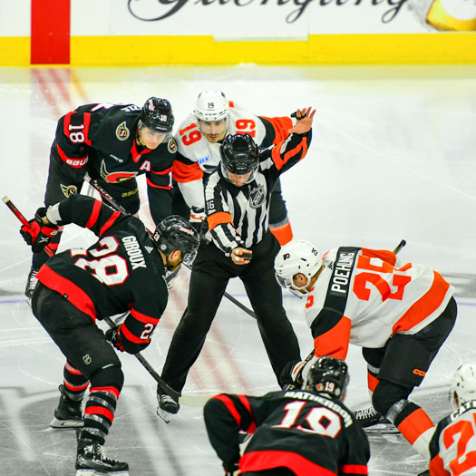 For the opening face-off, Claude Giroux #28 of the Ottawa Senators vs Ryan Poehling #25 of the Philadelphia Flyers