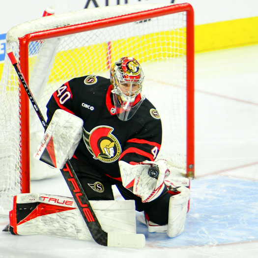 Mads Sogaard #40 of the Ottawa Senators makes a glove save