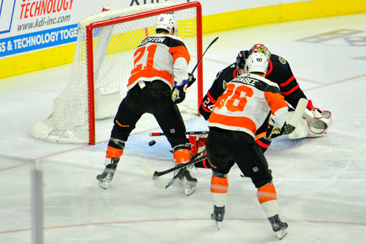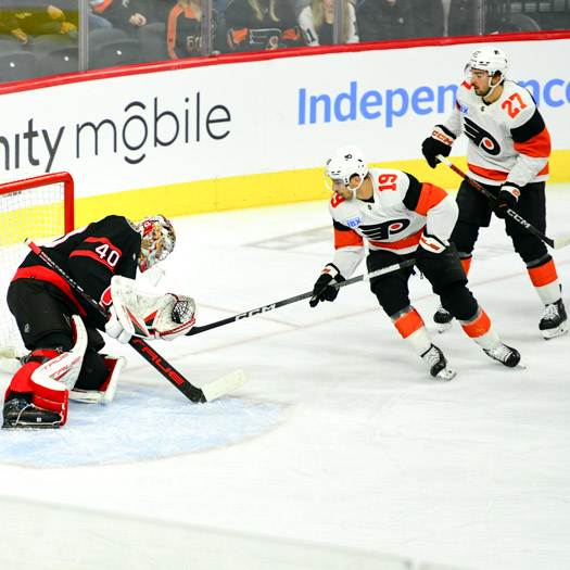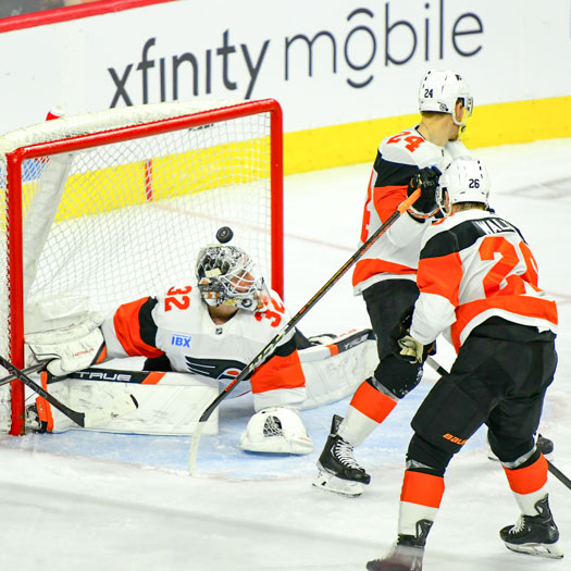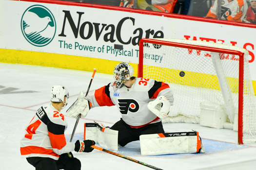 The puck ricocheted off both post behind goalie Felix Sandstrom #32 of the Philadelphia Flyers