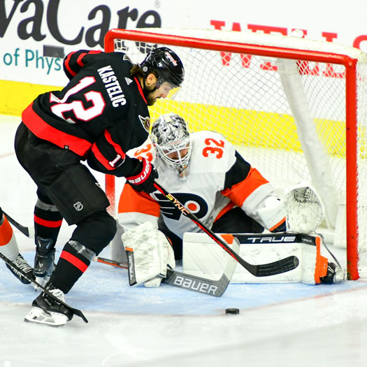 Felix Sandstrom #32 of the Philadelphia Flyers stops a shot by Mark Kastelic #12 of the Ottawa Senators