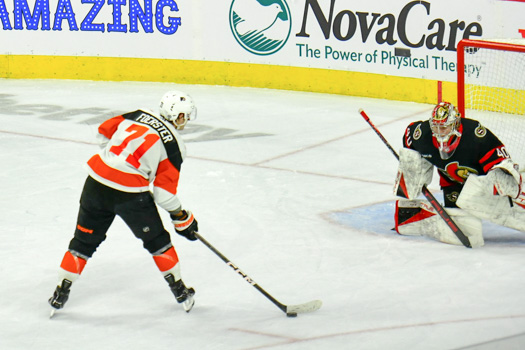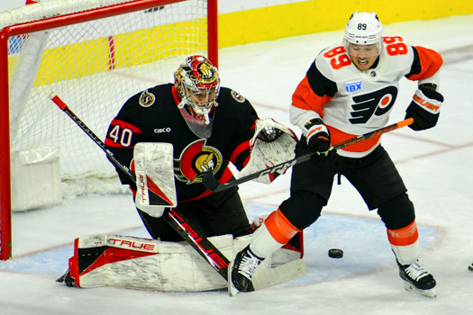 Cam Atkinson #89 of the Philadelphia Flyers attempts to redirect a shot past goalie Mads Sogaard #40 of the Ottawa Senators