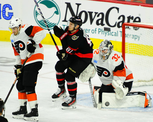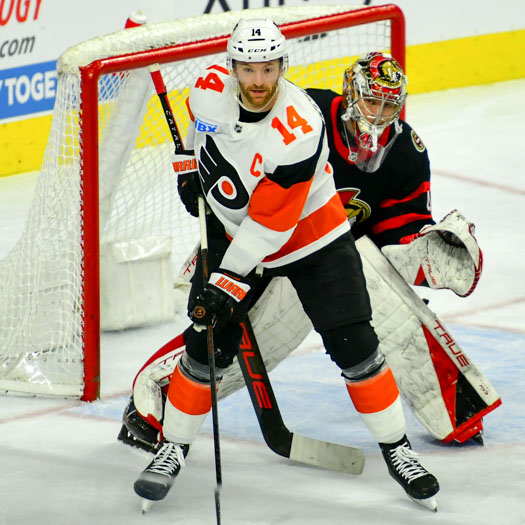 Sean Couturier #14 of the Philadelphia Flyers screens goalie Mads Sogaard #40 of the Ottawa Senators