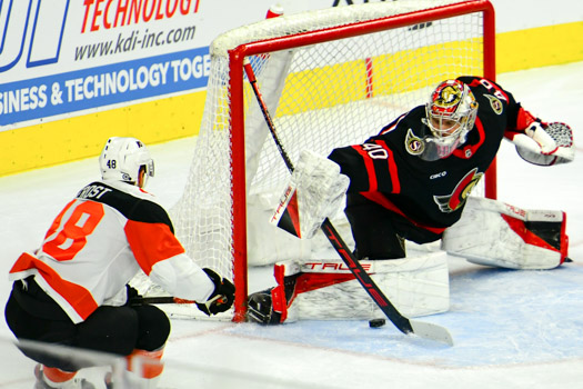 Mads Sogaard #40 of the Ottawa Senators makes a pad save against Morgan Frost #48 of the Philadelphia Flyers