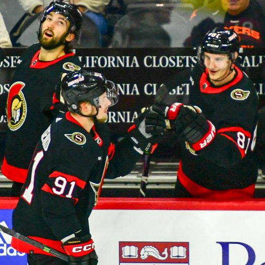 Thomas Chabot #72 of the Ottawa Senators being congratulated by his teammates for his goal in the third period.