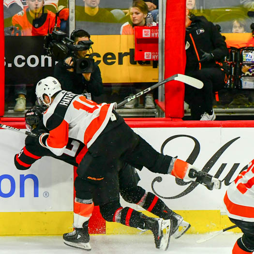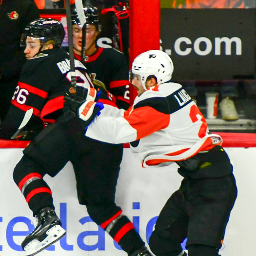 A check by Garnet Hathaway #19 of the Philadelphia Flyers buries Jacob Bernard-Docker #24 of the Ottawa Senators