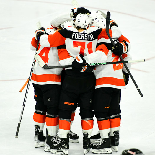 Tyson Foerster #71 of the Philadelphia Flyers get a group hug from his teammates for his goal against the Ottawa Senators.