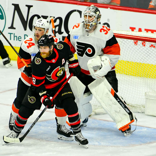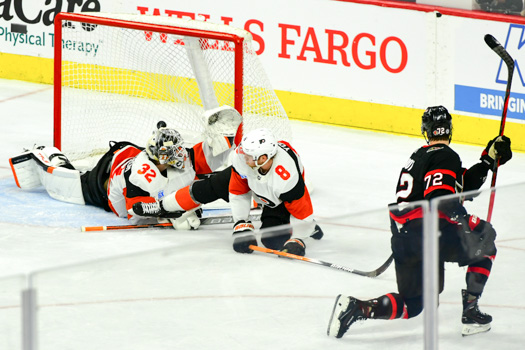 Felix Sandstrom #32 and Nick Seeler #24 of the Philadelphia Flyers defend their goal against Claude Giroux #28 of the Ottawa Senators